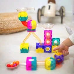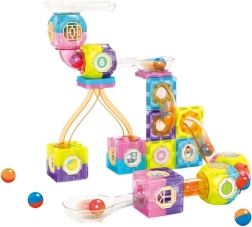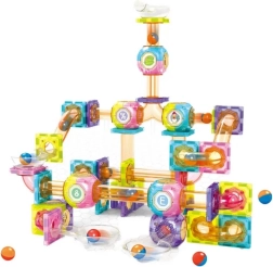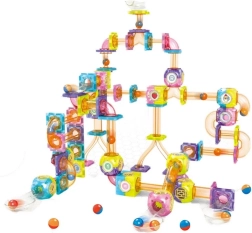 Ez a színes mágneses golyópálya végtelen építési lehetőséget kínál. A szivárvány színű, átlátszó elemek kísérletezésre ösztönöznek, miközben a mágnesek szilárdan egyben tartják a konstrukciót. A készletben csövek, ívek, csatlakozók és tálak találhatók, amelyek folyamatos gördülést biztosítanak a golyóknak.