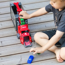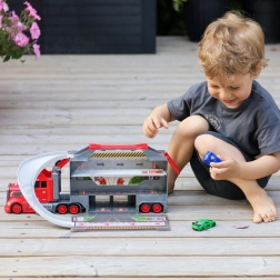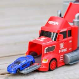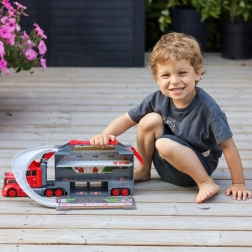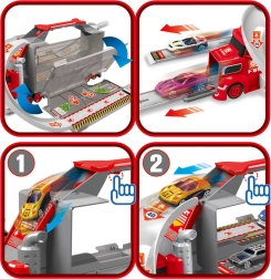 Ez a multifunkciós teherautó látványos tűzoltó dizájnnal szállító vontatóként szolgál, szétnyitva pedig komplett játékkészletté alakul garázzsal, parkolóhelyekkel és dinamikus pályával. A kisautó-kilövőnek köszönhetően a gyerekek egy szempillantás alatt elrajtolhatnak.
