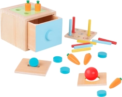 - Tartalmaz 26 darabot: egy fiókot, 4 rendező betétet, 1 piros labdát, 5 érmét, 5 répát, 9 pálcikát három színben