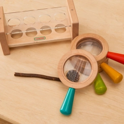 A készlet fa állvánnyal átlátszó tetővel van felszerelve, amely megkönnyíti a tárolást és védi a nagyítókat. A gyermekek kíváncsiságát és tanulását játék révén támogatják, hozzájárulva a megfigyelési készségek fejlesztéséhez.