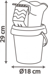 A szett mindent tartalmaz, ami a játékhoz kell: 18 cm átmérőjű vödörke szitával, gereblyével, lapáttal, szívecske vagy virág alakú formával és locsolókannával a vízhez. A kompakt méretek és a tartozékokkal együtt 29 cm-es magasság megkönnyítik a hordozást és a tárolást.