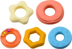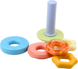 Minden gyűrű különböző textúrájú, és az egyikük csörgővel van ellátva. Ezáltal a játék különböző hang- és érzékszervi ingereket nyújt, amelyek támogatják az érzékelés és koncentráció fejlődését. Minden rész biztonságos, tartós anyagokból készült, amelyek teljesen megfelelnek a legkisebb felhasználók számára.