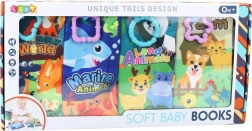 Ezek a puha könyvek teljesen biztonságosak és kíméletesek a csecsemők érzékeny bőréhez. Minden könyv kiemelkedő elemeket és susogó oldalakat tartalmaz, amelyek támogatják a gyerek szenzoros fejlődését - serkenti a tapintást, hallást és látást. A praktikus fogantyúk lehetővé teszik a könnyű rögzítést a babakocsihoz vagy autósüléshez. Minden könyvnek más a témája: dinoszauruszok világa, vízi állatok, szárazföldi állatok és farm, amely gazdagítja a minket körülvevő világ felfedezését.