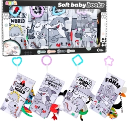 Puha érzékszervi könyvek készlete csecsemőknek, amely gazdag tematikát kínál, ösztönözve a gyermekek képzeletét, segítve őket az őket körülvevő világ sokszínűségének felfedezésében. A könyvek puha, kellemes anyagokból készülnek, amelyek teljesen biztonságosak az érzékeny bababőr számára. Minden könyv kiemelkedő elemeket és zörgő oldalakat tartalmaz, amelyek segítik a gyermek érzékszervi fejlődését - ösztönözve a tapintást, hallást és látást.