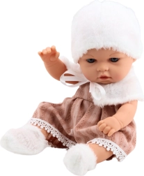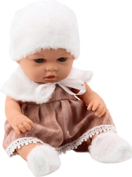 A baba bézs ruhát visel, hímzett textúrával és csipkével, kiegészítve fehér szőrmegallérral és puha sapkával, amely a nyak alatt megköthető. A megjelenést szőrme zoknik teszik teljessé, amelyek otthonos téli kinézetet kölcsönöznek a babának.