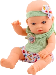 A ruha puha zöld felsőből, virágos alkalmazással, és rövid színes nadrágokból áll, virágmintával, amely tavasszal-nyárral vonzó stílusával magára vonzza a figyelmet. A masnis fejpánt még több eleganciát és lányos bájt kölcsönöz a babának.