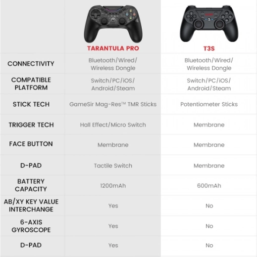 Szerezz versenyelőnyt a GameSir Tarantula Pro játékvezérlővel, amely ötvözi az ultragyors reakcióidőt, a precíz irányítást és a széles kompatibilitást. Mag-Res TMR mágneses karokkal, Hall-effektusú ravaszokkal Hair Trigger móddal, RGB világítással és három csatlakozási móddal érkezik, hogy Switch, PC, iOS, Android és Steam platformokon is játszhass.