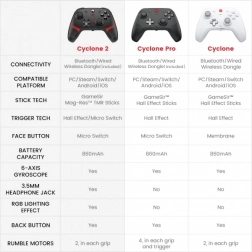 A GameSir Cyclone 2 csúcsszintű irányítást nyújt verseny- és szabadidős játékhoz egyaránt. Az új Mag-Res TMR karok egyesítik a pontosságot és a tartósságot, míg a Hall-effektusos ravaszok rendkívül egyenletes visszajelzést adnak, Hair Trigger móddal a villámgyors akciókhoz. A 6 tengelyes giroszkópnak köszönhetően SWITCH eszközökön élvezheti a pontos célzást és a finom mozgásirányítást.