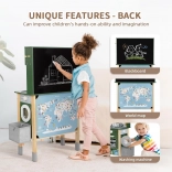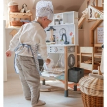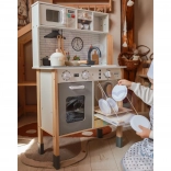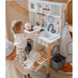 Ez a WOOPIE GREEN fa konyha a kis szakácsok és felfedezők számára készült. Az elülső rész gazdagon felszerelt kulináris zónát kínál kávéfőzővel, mikróval, mosogatóval, sütővel, mosogatógéppel és indukciós főzőlappal fényekkel és hangokkal. Oldalt egy praktikus mosógép szennyestartó kosárral segíti játékosan a napi rutinok elsajátítását. A hátoldalon krétatábla és színes világtérkép található rajzoláshoz, a kontinensek megismeréséhez és a fantázia fejlesztéséhez.