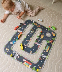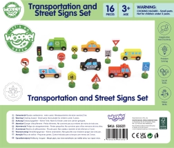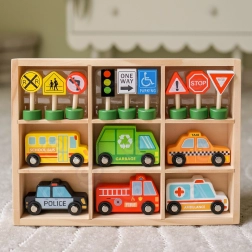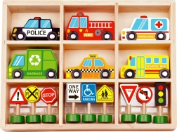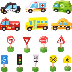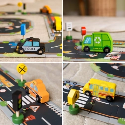 A készlet 6 járművet, egy jelzőlámpát és 8 táblát tartalmaz, amelyek segítik a gyerekeket a közúti közlekedés alapvető szabályainak természetes elsajátításában.