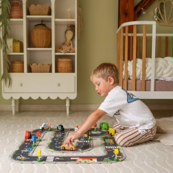 Jelenetek építése, az autók tologatása és a táblák használata fejleszti a finommotorikát, a kreativitást és a szociális készségeket a közös játék során.