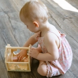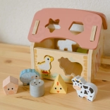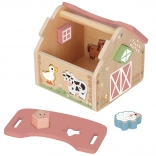 A tető egyszerűen nyitható a könnyű kivételhez és elpakoláshoz. A gondosan megmunkált fa elemek lekerekített élekkel biztonságos játékot biztosítanak. A csomag válogatott állatkákat (tehénke, bárányka, póni, liba) és mintás formákat tartalmaz, amelyek támogatják a szókincs fejlesztését és a fantáziát.