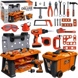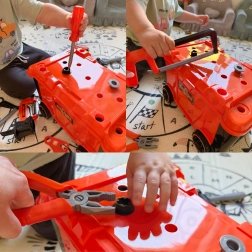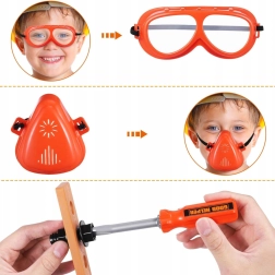 A csomag része a védőszemüveg, satu, fűrész, fogó, csavarhúzók és kulcsok. A gyerekek biztonságosan kipróbálhatják a munkát, akár az igazi szakemberek.