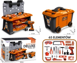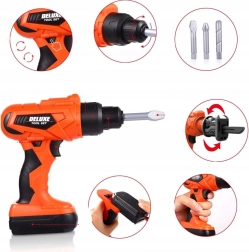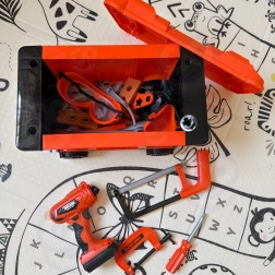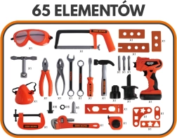 A csomag tartalmaz többfunkciós, elemes szerszámot cserélhető feltétekkel, bőséges csavarkészletet, anyákat és műanyag „deszkákat” a csavarozás, fúrás és összeállítás gyakorlásához. Nem hiányzik a védőszemüveg és más hasznos kiegészítők sem a valósághű, mégis biztonságos játékhoz.