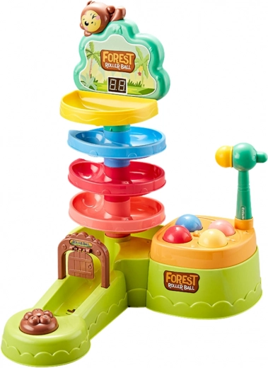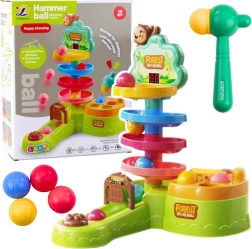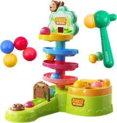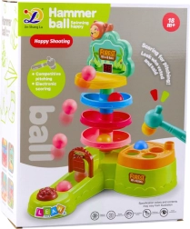 A golyópálya biztonságos, színes és tartós anyagokból készült, amelyek felkeltik az érdeklődést és ösztönzik a játékra. Kezdje a játékot az egyik négy golyó elhelyezésével a pálya tetején. A gyermek a kalapács ütésével mozgásban tartja, és figyeli, ahogy lecsúszik, ami fejleszti a koordinációt és az ok-okozat megértését.