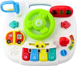 A panel számos mozgó és interaktív elemet tartalmaz: kormány duda funkcióval, fényjelzést, do-re-mi-fa zongorabillentyűk, forgatható hangerőszabályzó, képeskönyv járművekkel, tükör, mozgatható sebességváltó kar, kisautó és további színes gombok. A gombok megnyomása után a gyermek autóhangokat, dalokat, vidám dallamokat hall, és fényhatásokat indít el.