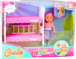Ebben a szettben megtalálható egy 12 cm magas baba ragyogó, színes ruhákban, egy aranyos kutyus, valamint egy funkcionális emeletes ágy létrával – tökéletes a házba való játékokhoz, a kisállat gondozásához és mindennapi jelenetek megalkotásához.