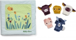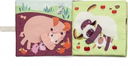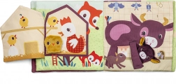A Lilliputiens textilkönyv farmbéli szórakozást kínál a mellékelt ujjbábokkal, amelyek tartalmaznak borjút, csibét, bárányt, malacot és szamárcsikót tépőzárral. Ezek a bábok szabadon áthelyezhetők, így a gyermek fejlesztheti ügyességét és kreativitását.