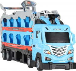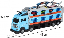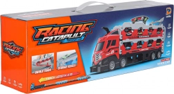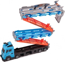 Ez a multifunkciós készlet egyesíti az autószállítót és a hosszú versenypályát egyben. Szétnyitva a kamionból 210 cm hosszú, dupla pálya lesz, amelyen a gyerekek izgalmas futamokat rendezhetnek és rekordokat mérhetnek.