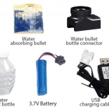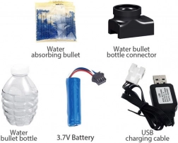 A dobozban blastert, tárat, védőszemüveget, tölthető akkumulátort és USB-kábelt találsz. Csak hidratáld a golyókat, és máris kezdődhet a játék.