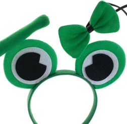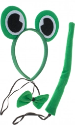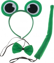 Ez a vidám béka szett pillanatok alatt kedves kis békává varázsolja a gyermekedet. A csomagban mindent megtalálsz a gyors beöltözéshez: fejpánt nagy békaszemekkel, zöld csokornyakkendő és farok. Az univerzális méreteknek és a puha textilnek köszönhetően a kiegészítők kényelmesek, és könnyen kombinálhatók a már meglévő ruhákkal.