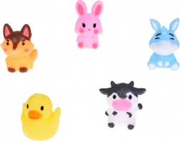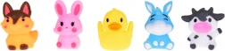 A készlet tartalmaz: 5 gumi farm állatfigurát, mindegyik más színű (nyúl, tehén, kutya, kacsa, szamár) körülbelül 5 cm x 4 cm x 4 cm méretben. A játék biztonságos, gumi anyagokból készült, amelyek barátságosak az érzékeny gyermeki bőrhöz. Könnyen karbantartható és nagyon tartós, így hosszú ideig bírja.