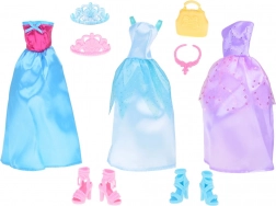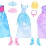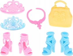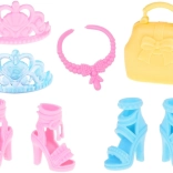 Két elegáns magas sarkú cipő pár további bájt és stílust kölcsönöz az összmegjelenésnek. A kiegészítők, mint a hatékony kézitáska, rózsaszín nyaklánc és két korona tökéletesek minden kis hercegnő számára.