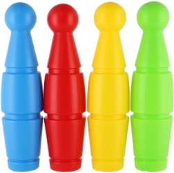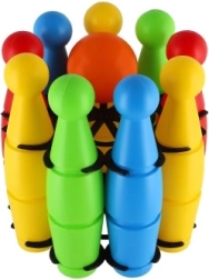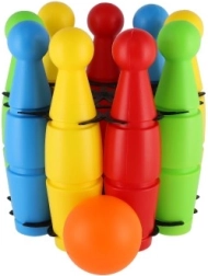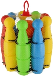 Szórakoztató készlet kis bowlingozóknak, amely 9 színes műanyag bábút és egy műanyag golyót tartalmaz. Könnyű és biztonságos játék beltérre és kertbe, segít fejleszteni a finommotorikát, a koncentrációt, a pontosságot és a fair play szellemet. A bábuk magassága 24 cm, a teljes készlet pedig praktikus hálós csomagolásban van.