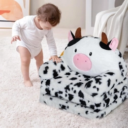 A bájos dizájn jellegzetes fehér-fekete foltokkal, barátságos arccal, rózsaszín orral, kiálló fülekkel és puha szarvakkal azonnal megragadja a gyerekek figyelmét, és vidám, otthonos légkört hoz a szobába. A bőr motívum tökéletesen illeszkedik a gyerekszoba dekorációjához, és funkcionális kiegészítőjévé válik.