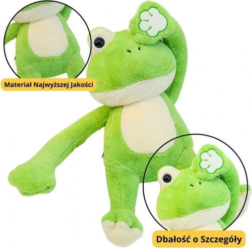 A plüss béka szórakoztató és kreatív játék, amely lenyűgöz megjelenésével és funkcionalitásával. Mágneseket tartalmaz a mancsokban és a szemekben, melyekkel a béka el tudja takarni a szemét, így lehet játszani a „kukucska” játékot, ami tökéletes a kreatív játékra, fejlesztve a gyermek képzeletét és készségeit. A klasszikus zöld szín, világos has, nagy szemek és barátságos mosoly rögtön kedvenccé teszi a legkisebbeknél.