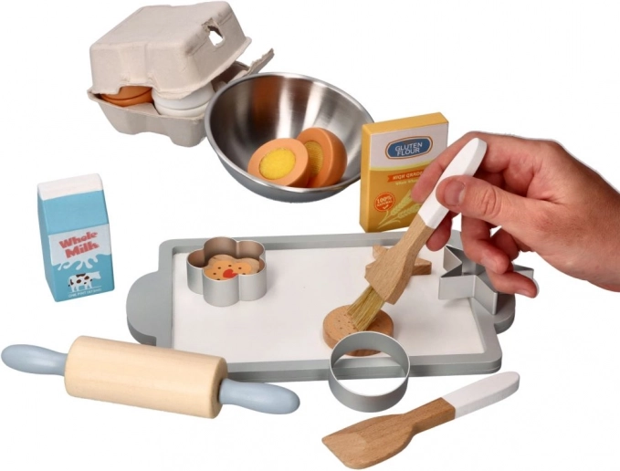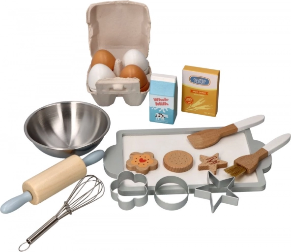 - Konyhai kiegészítők válogatása: sodrófa, habverő, tál, kiszúrók, ecsetek és további sütős játéktartozékok