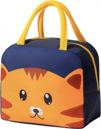 Praktikus és aranyos termoizolációs táska vidám kandúr mintával nagyszerű választás gyermekeknek, akik iskolába vagy kirándulásra viszik a harapnivalókat, frissítőket vagy italokat. Az élénk színek kombinációja - kék, narancs és sárga - vonzza a figyelmet és pozitív hangulatot hoz.
