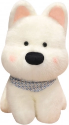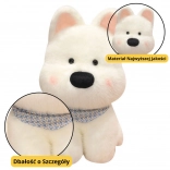 A plüss kutyus finom fehér szőrrel és fekete szemekkel rendelkezik, amelyek különösen aranyos megjelenést kölcsönöznek neki. Az összképet a kék tónusú díszkendő gazdagítja, amely kiemeli barátságos jellemét.
