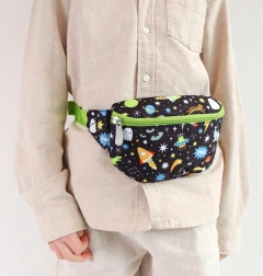 Ez a sötétkék deréktáska űrbeli mintázattal nem csak örömet szerez, hanem a használhatóságot is növeli. A kellően nagy elülső zseb pénztárca és mobiltelefon számára, valamint a hátsó cipzáras zseb az apró értéktárgyaknak, ideálissá teszik a mindennapi kalandokhoz.