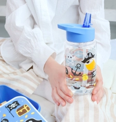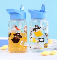 Átlátszó gyerekpalack kalózmintával. Ideális kirándulásokra vagy óvodába köszönhetően a szivárgásmentességének.