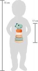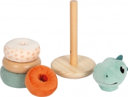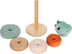 Ez a motorikus játék egy billegő torony formájában, négy színes gyűrűvel ideális a méretek és színek felismerésére. A torony tartalmaz egy biztonságos mozgatható középső rudat és egy mosolygós dinoszaurusz fejet. A lekerekített alap stabilitást biztosít, míg a különféle anyagokból készült szövet és fa gyűrűk megkapóak a dizájnjukkal.