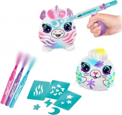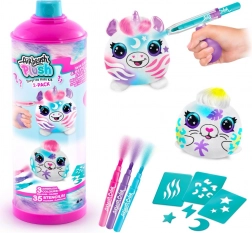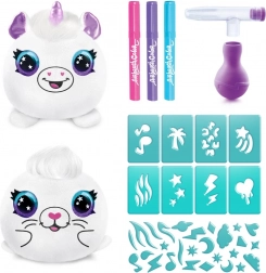 Szórakoztató és kreatív készlet airbrush eszközzel és három filctollal, mely végtelen design lehetőségeket biztosít. A csomag két meglepetés 10 cm-es plüssfigurát tartalmaz, melyeket a mellékelt sablonok segítségével saját fantáziád szerint díszíthetsz. A sorozat összesen 6 különböző plüssfigurát kínál, így minden csomag egyedi!