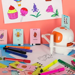 Edukatív interaktív robot rajzolás és írás tanulásához kártyákkal és filctollakkal