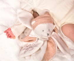 Ez a plüss mackó puha rózsaszín gyapjúszövetből készült, és finom hímzéssel díszített. A nagy szirmok a testén segítik a gyermek finom motorikus képességeinek fejlődését, miközben kényelmet és biztonságérzetet nyújtanak.