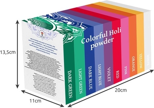 Élje át a színes fesztiválok hangulatát a 10 élénk árnyalatot tartalmazó teljes készlettel. A HOLI színes por kukoricakeményítőből és minőségi színezékekből készül, ennek köszönhetően könnyű, szépen száll, és fotogén hatásokat kelt levegőbe dobva vagy csoportos eseményeken.