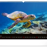 A naptár kezdő oldala a korallzátonyok között úszó gyönyörű tengeri teknősökhöz vezet. Ez a fotó bizonyítja az óceán világának tökéletességét.