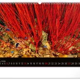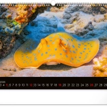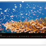 A márciusi naptárlap energiával tölti fel a korallzátonyok között nyüzsgő kis halacskák képével. A kékinger háttér dinamikát és frissességet kölcsönöz a képnek.
