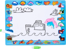 A tábla hátulján található egy 30 x 22,5 cm-es szárazon letörölhető tábla, amelyen a gyermek az összeszerelt filccel saját rajzokat készíthet. Ez kiváló módja a képzelőerő fejlesztésének és a finommotorikus készségek gyakorlásának.