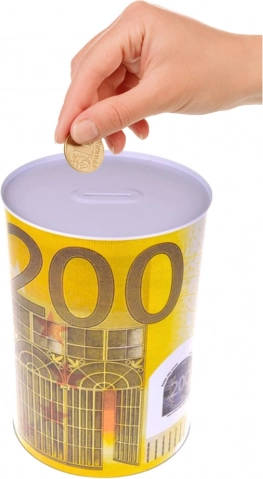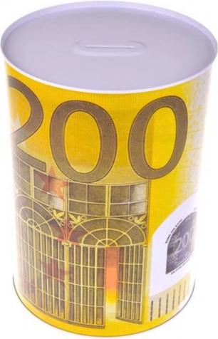 Fém persely, amely egy 200 eurós bankjegy motívumaival ellátott doboz alakú