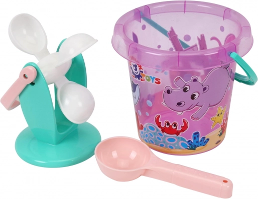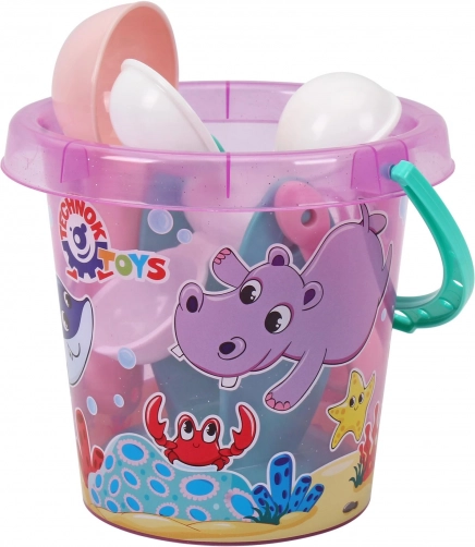Könnyű, tartós vödör tengeri állatos mintával víz és homok hordásához. Ideális méret a kis gyerekkezekhez.