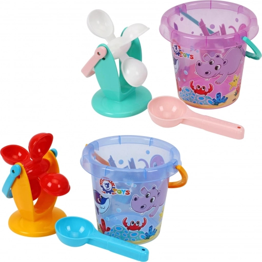 Ez a kompakt homok- és vízjáték szett órákon át tartó szórakozást és tanulást nyújt a gyerekeknek. Az átlátszó, tengeri állatos mintájú vödör ideális víz vagy homok szállítására, a víz-/homokmalom pedig víz öntésekor vagy homok szitálásakor megforog, ami motiválja a gyerekeket a felfedezésre és kísérletezésre.