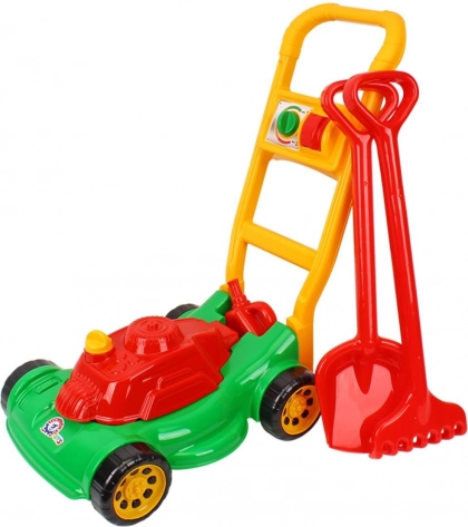Ez a színes műanyag fűnyíró kiegészítőkkel remek játék az első kertészkedési próbálkozásokhoz. A gyerekek tologathatják a fűnyírót, tekerhetik a kezelőszerveket és utánozhatják a felnőttek munkáját, ami fejleszti a finommotorikát és a képzelőerőt. A könnyű kialakítás és a lekerekített élek biztonságos játékot biztosítanak a legkisebbeknek is.