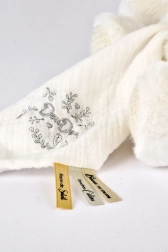A mackó fel van szerelve egy takaróval, amelyet könnyen el lehet rejteni a hasában, ami nagyon praktikus utazás vagy tárolás során. A Doudou finom hímzéssel és szatén szalagokkal is rendelkezik, francia feliratokkal, amelyek minden ölelést lágyabbá tesznek.