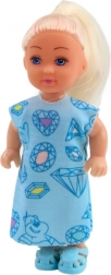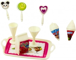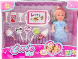 A készlet tartalmaz egy 12 cm magas babát, amely kék ruhába öltözött aranyos mintákkal és tematikus kiegészítőkkel, mint például nyalókák, fagyik, tölcsérek és egy tálca harapnivalóval. Ezek a kiegészítők nem csak hogy színesítik a játékot, de támogatják a képzelet, kézügyesség és a szociális készségek fejlődését is a gyermekben.