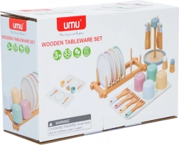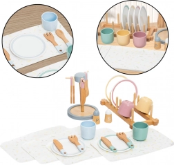 Ezzel a fa étkészlettel a gyerekek játszhatnak háztartást, éttermet vagy rendezhetnek teapartikat barátaikkal. Minden elem gondosan készült jó minőségű, biztonságos és tartós fából, amely ellenáll az intenzív használatnak is. Az étkészlet tartalmaz tányérokat, tálakat, bögréket, kanalakat, villákat, szalvétákat, fűszereket és edénytartót.